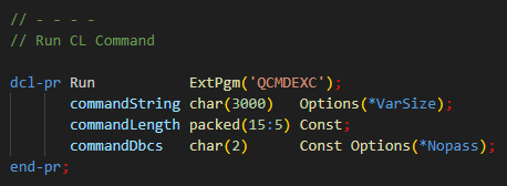 まずは、PCオーガナイザーを開始(STRPCO)するのに必要となる、QCMDEXCプロトタイプを定義します(図1)。PCコマンドを実行するには、PCオーガナイザーが稼働している必要があります。PCオーガナイザーは、PCコマンドが実行されるジョブで一度開始する必要があるだけです。