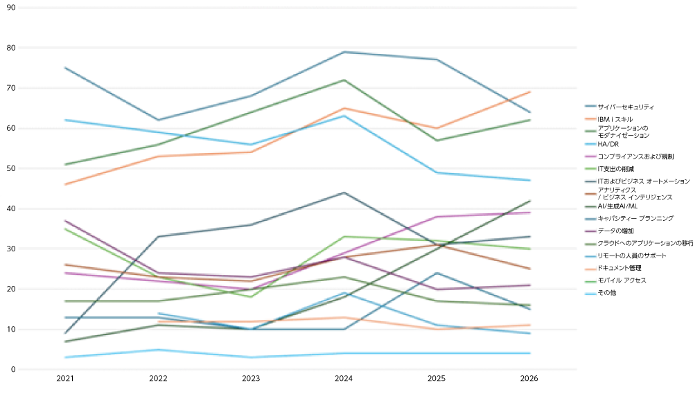 IBM i スキルの問題が前面に出るようになるのにつれて、セキュリティに対する懸念は後退しているようです。2024年版の調査で、過去最高の79%でピークを迎えた後、セキュリティ(または「サイバーセキュリティ」。Fortra社の最新の用語です)は、2025年には77%に低下し、2026年版の調査では64%へと激減して、62%の「アプリケーションのモダナイゼーション」にすぐ近くまで迫られています。