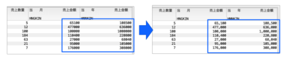 これらの設定を有効にすると、下図のように数値がカンマ区切りで表示され、可読性が大きく向上します。