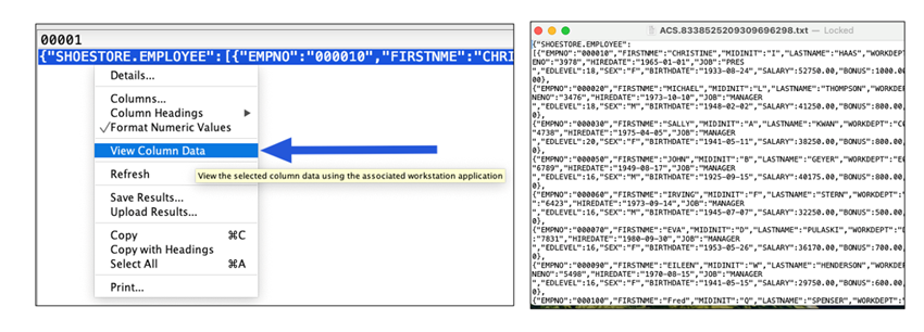 近年、IBM i でも JSON形式のデータをSQLで扱うケースが増えてきました。従来は、JSON列の値が1行のテキストとして表示されるため、構造が分かりにくいという課題がありました。ACS 1.1.9.8以降では、JSON型の列を右クリックし、「View Column Data」を選択することで、整形されたJSONビューで表示できるようになりました。