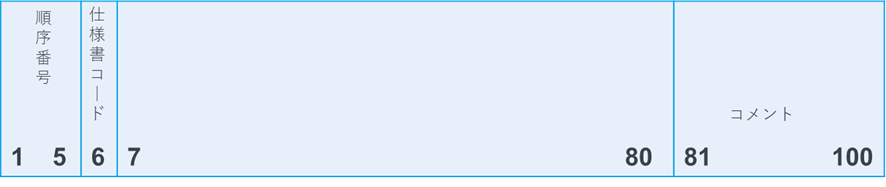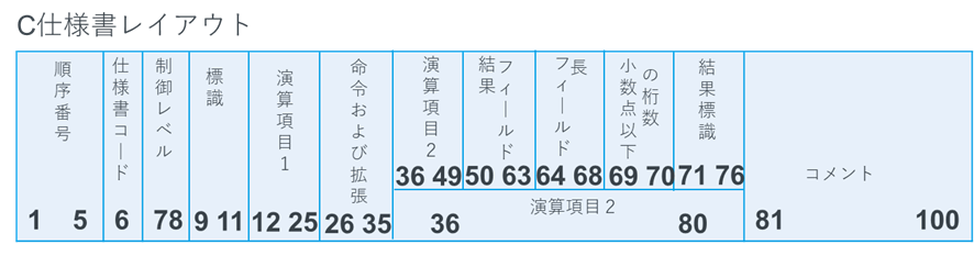 松田:「例えば、プログラムの内容を記述する演算仕様書は、C仕様書と呼びます。他の仕様書も同様に、F仕様書やD仕様書と呼びますね。それぞれの仕様書毎に記載する内容の桁数が決まっています。例として、一番よく利用するC仕様書のレイアウトを見てみましょう。以下のように、先ほどお話しした仕様書コードは6桁目で、『C』が入ります。また、演算の命令は26~35桁目に入りますよ。」