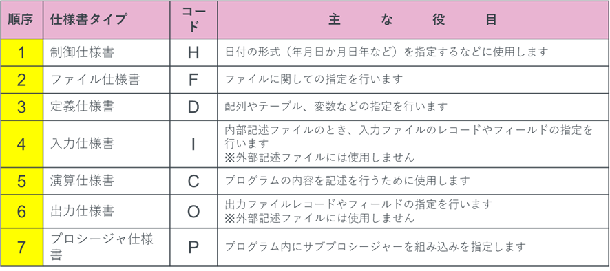 松田:「先ほど少し触れましたが、RPGのソースを作る際は、仕様書に従って作成する必要があります。ILE RPGの仕様書は以下の通りです。記載の順序も以下の通り決まっていて、必要のない仕様書は省略できます。」