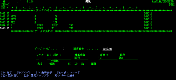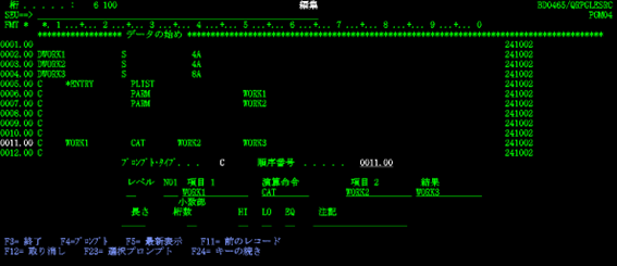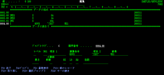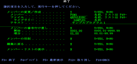渡邊:「はい、【PGM2】が完成しました。編集内容を保存し、【PGM2】のソースメンバーのOPTに『14』を入れて『F4』を押し実行です。このまま、コンパイルを行っていきます。」