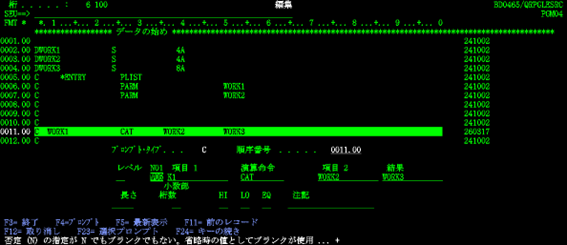 松田:「実際のSEU画面でC仕様書を見てみましょう。このプログラムにおける0011行目のコマンドでは、CAT(concatenate から来ている)すなわち文字列を連結するコマンドで、変数名 WORK1(演算項目 1)の文字列の後に WORK2(演算項目 2)文字列を連結し、その結果を WORK3(結果フィールド)文字列に格納しています。以下の正しいパターンを見ると、5行目以降は、行により入力内容が違いますが、桁位置が揃っています。例えば、11行目の項目1(演算項目1)に入っている【WORK1】は12桁目から始まっており、先ほどお見せしたレイアウトとも合っていますね。一方で誤ったパターンを見ると【WORK1】が本来【*ENTRY】の下にあるべきですが、左にずれてしまっており正しい位置にないのでプロンプト画面と11行目が反転し、下部にエラーが出ています。」