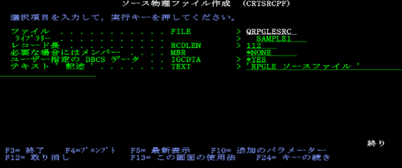 CRTSRCPF FILE(SAMPLE1/QRPGLESRC) RCDLEN(112) IGCDTA(*YES) TEXT('RPGLEソースファイル')