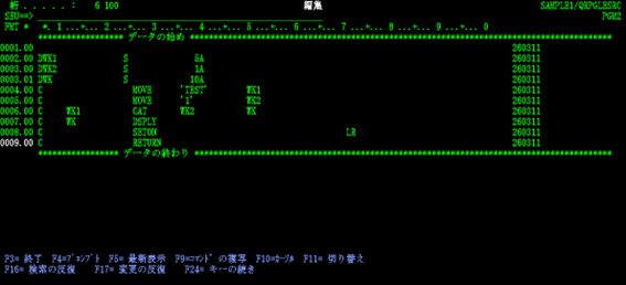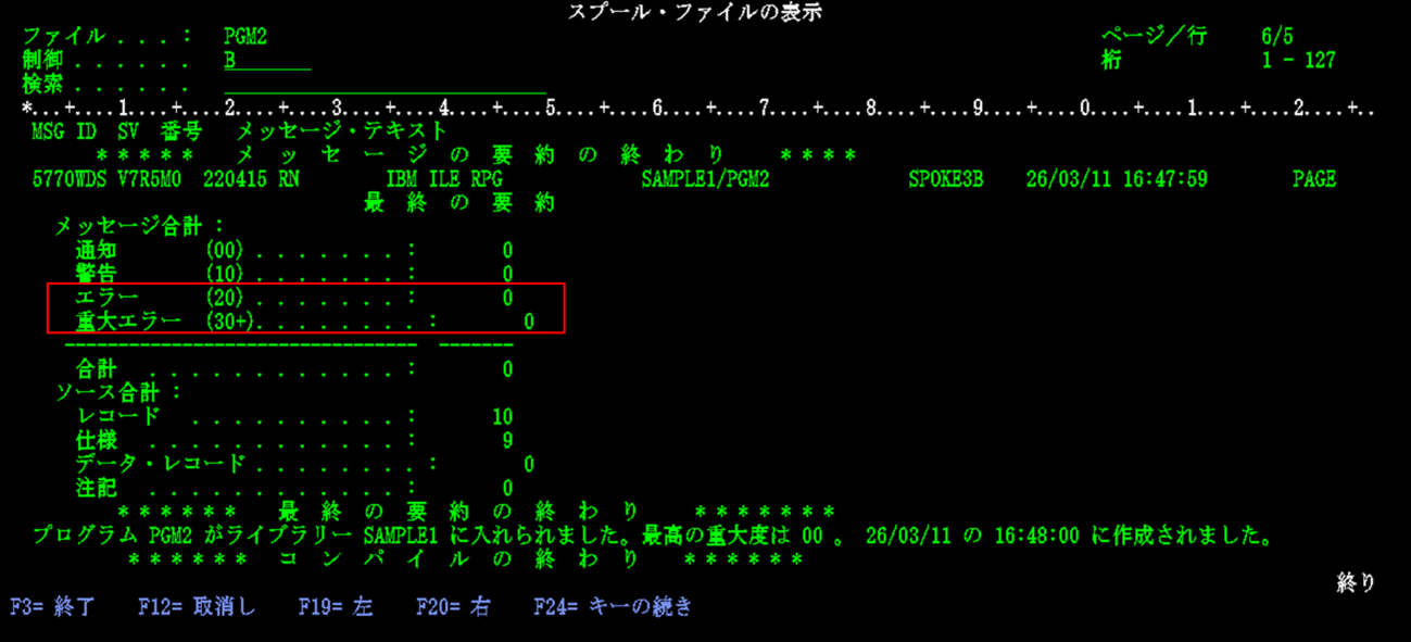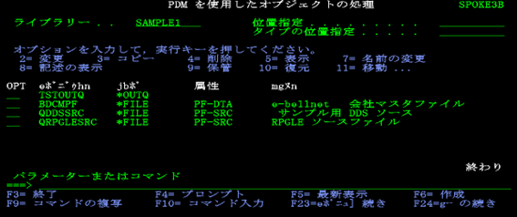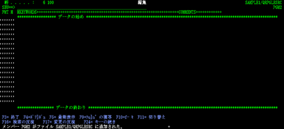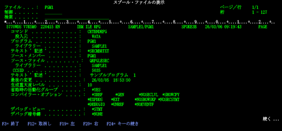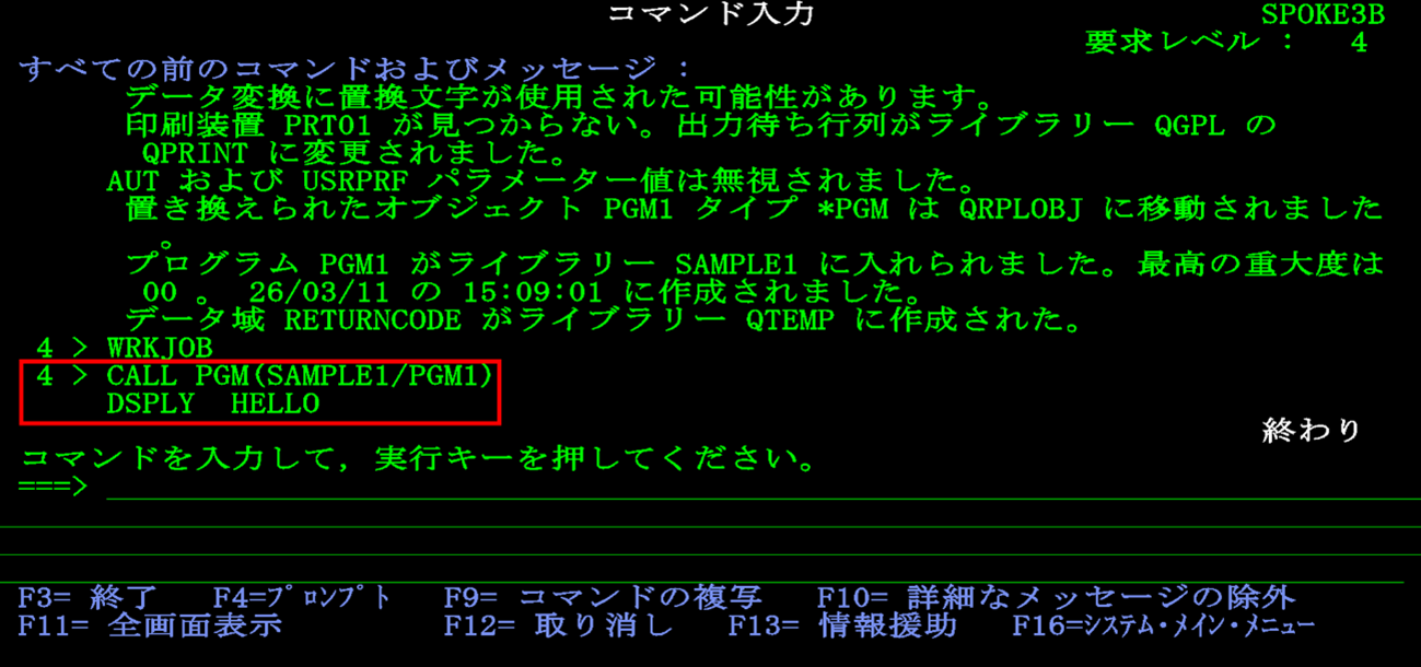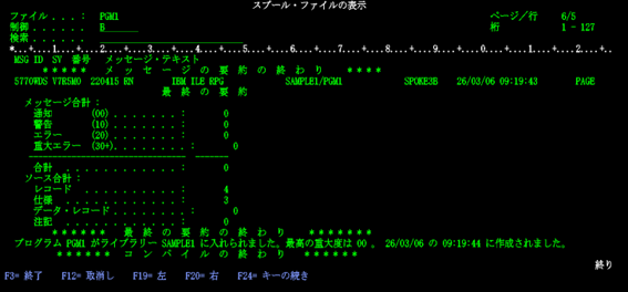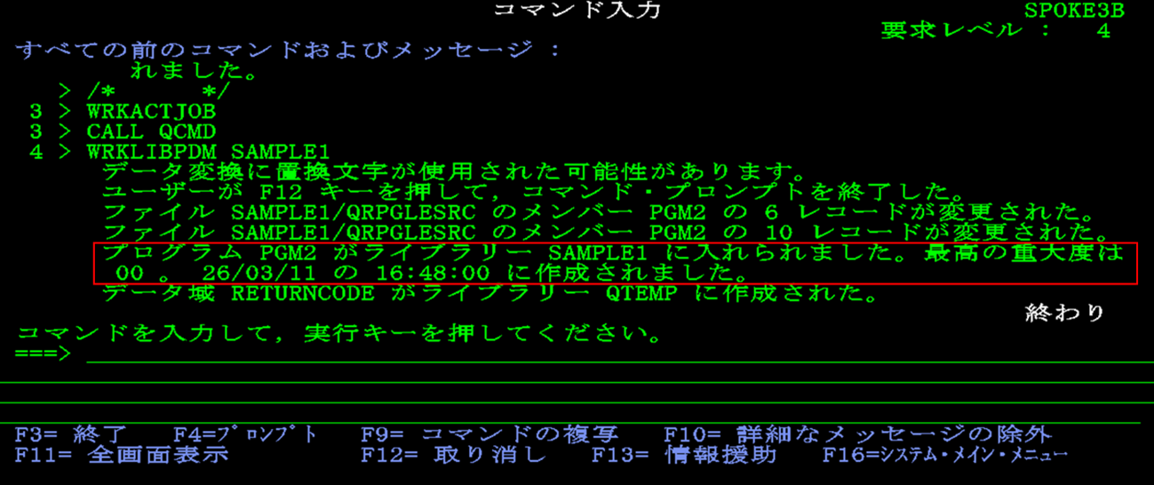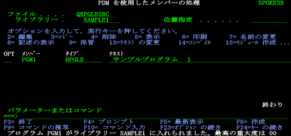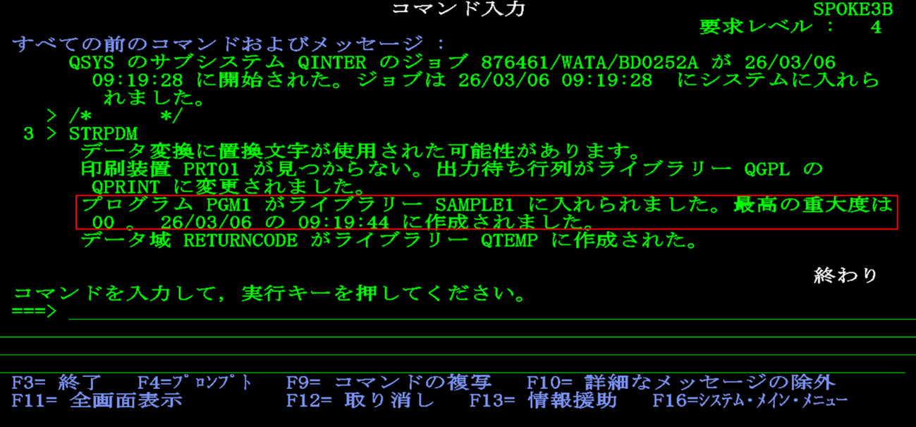 渡邊:「コマンド入力画面に戻りました。先ほど表示されていたメッセージの続きが出ていますね。【プログラムPGM1がライブラリーSAMPLE1に入れられました。最高の重大度は00】と出ています。」