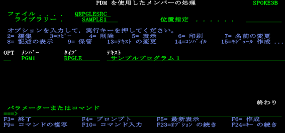 松田:「はい。先ほど『F6キー』を押してメンバー追加を行ったPDMの画面に戻りましたね。(もし、戻らない場合は、コマンド『WRKOBJPDM LIB(SAMPLE1) OBJ(QRPGLESRC) OBJTYPE(*FILE) 』を入力、実行キーを押してPDMの画面を表示します。)ソースメンバー【PGM1】ができていますね。では、コンパイルする前に、コンパイルの設定を確認するために、『F18』キーを押しましょう。」