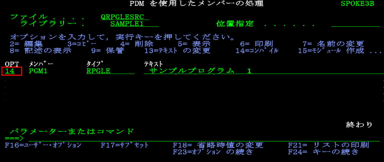 松田:「それではいよいよコンパイルです。先ほど作成したソースメンバーのOPTに『14』を入れて(以下画面)、『F4』を押してください。」