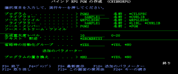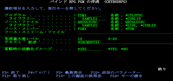 松田:「コンパイルして作成されるプログラムとライブラリー、またソースファイルとライブラリー、ソースメンバーの全ての名前を確認して実行キーを押しましょう。コンパイルが完了すると、プログラムとライブラリーで指定した内容で、RPGプログラムが作成されます。冒頭で、、ILE 言語モデルでは、コンパイルの後にバインド(リンク)を経ることで実行コードが生成されるとお伝えしましたが、実はコマンド【CRTBNDRPG】では、内部でコンパイルとリンクの両方の処理を一度に実行します。このため、ユーザーは個別にコマンドを入力する必要がなく、コマンドの完了後にはプログラムが出来上がっているという状況になります。」