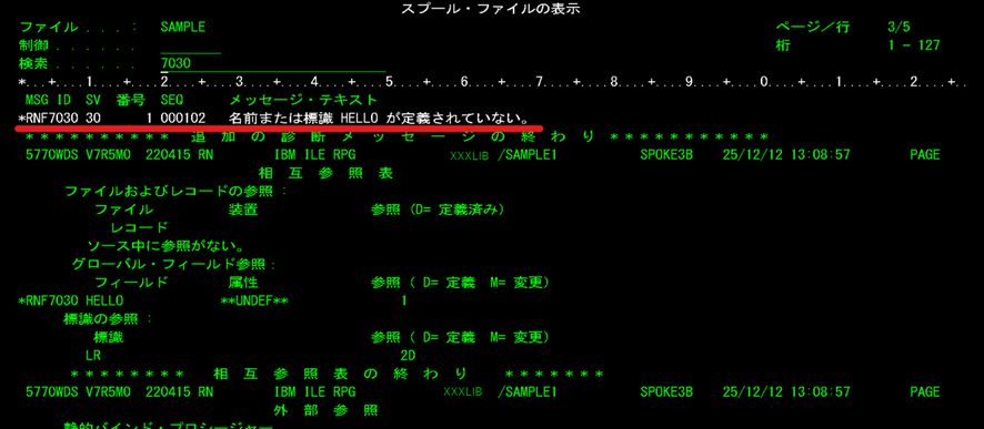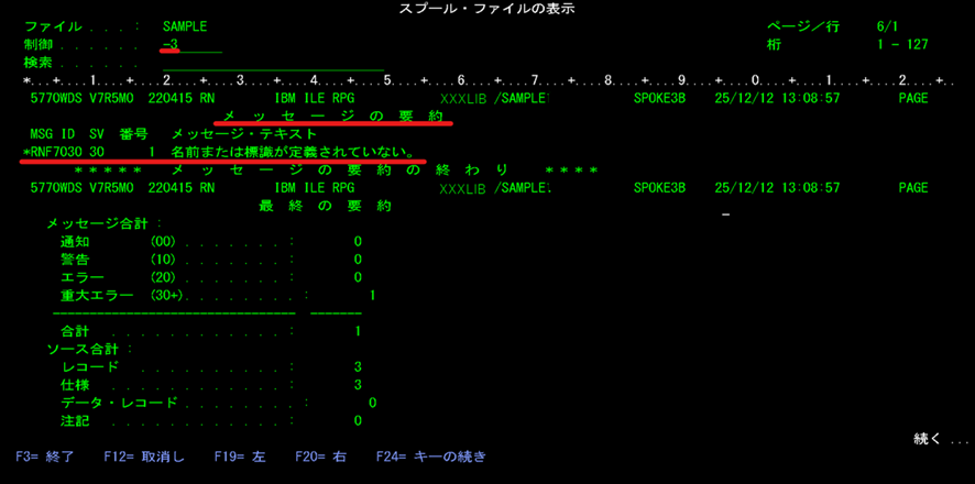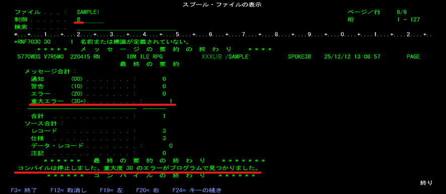 松田:「そうです。スプールファイルの中身が表示されますね。これをコンパイルリストと呼びます。コンパイル時の詳細な情報が表示されるのですが、最終結果は最下部に表示されるので、制御に『B』を入れて実行を押してください。Bはボトムを意味しています。」