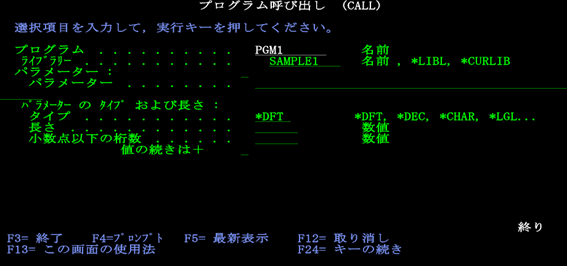 渡邊:「プログラム呼び出しの画面が出ました。プログラムに『PGM1』、ライブラリーに『SAMPLE1』を入力して実行ですね。」