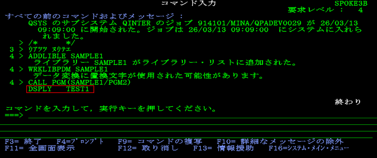 渡邊:「実行しました。【DSPLY TEST1】という結果が表示されていますね。期待通りの結果になっています。」