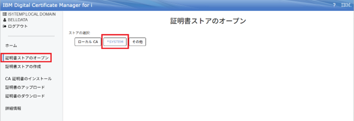 ログイン後、証明書ストアを選択します。通常は「*SYSTEM」を使用します。