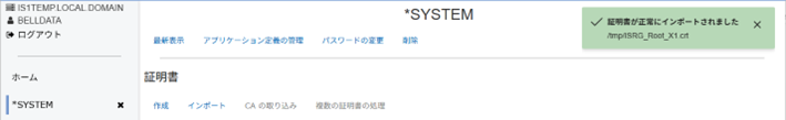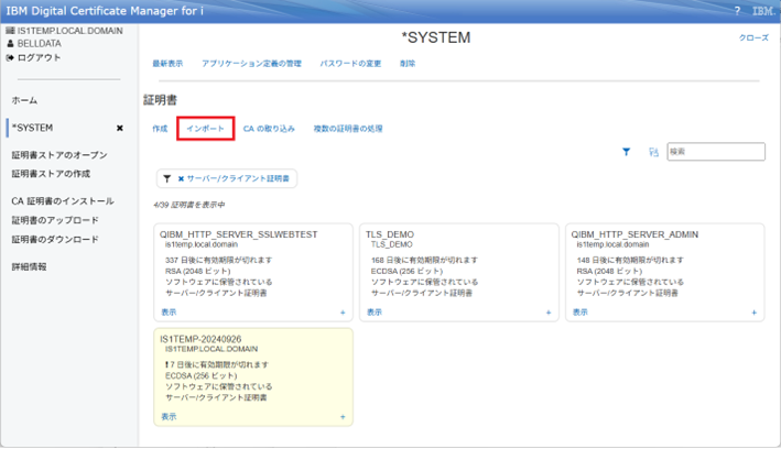 証明書ストア「*SYSTEM」をオープン後、「インポート」をクリックし証明書のインポートを行います。