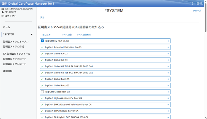 IBM i が持っているCA証明書の一覧が表示されますので、取り込みたい証明書を選択します。