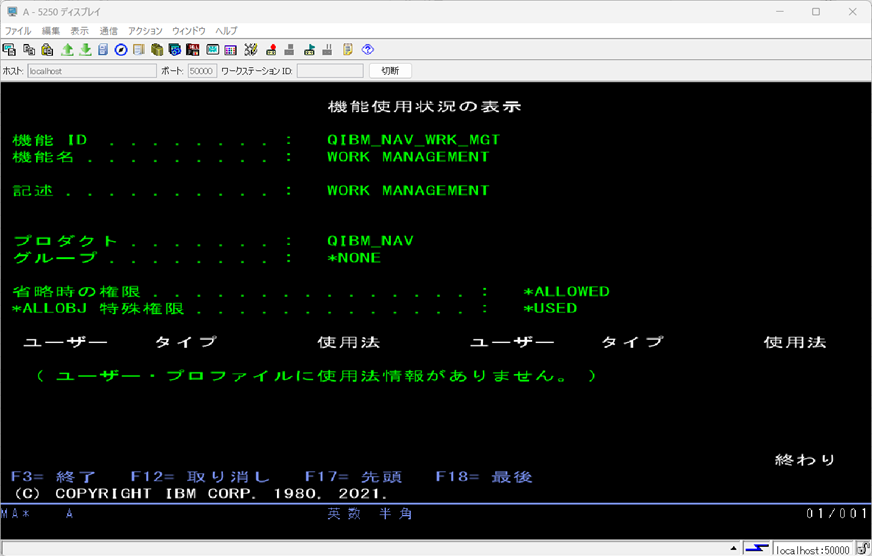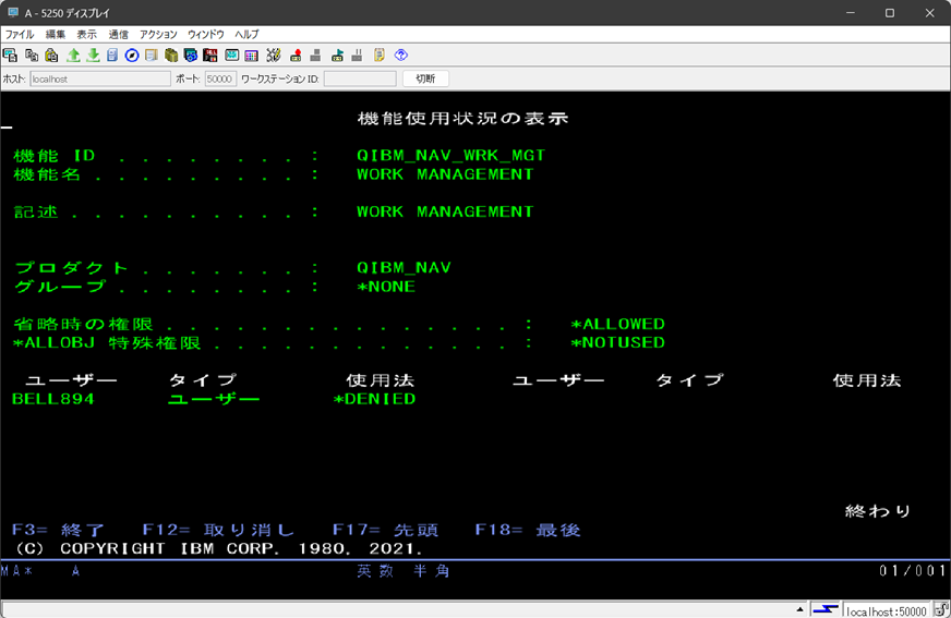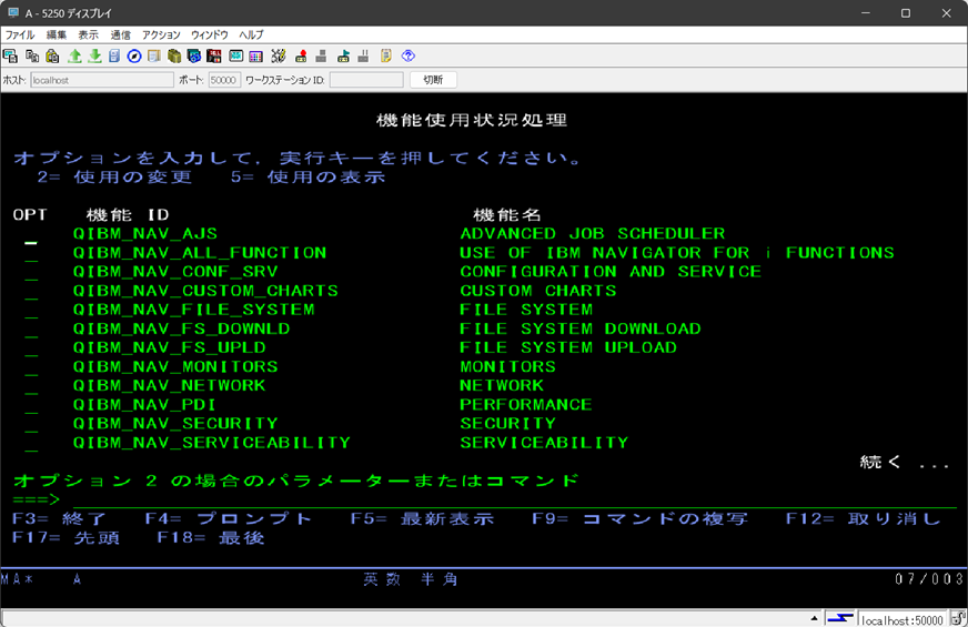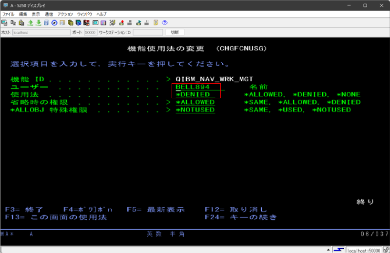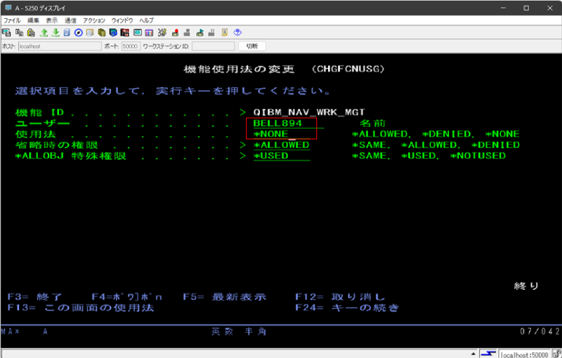 - 機能ID 「QIBM_NAV_WRK_MGT」の行へ「2=使用の変更」を入力し実行キーを押します。
