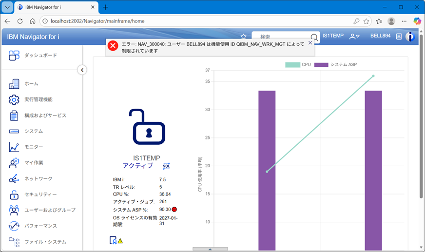 - 機能制御をしたユーザーで Navigator for i へログインし「実行管理機能」→「アクティブ・ジョブ」を選択してみます。