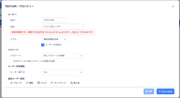 しかし、あるユーザー・プロファイルの「記述」(テキスト記述)を変更しようとするとエラーになってしまいます。